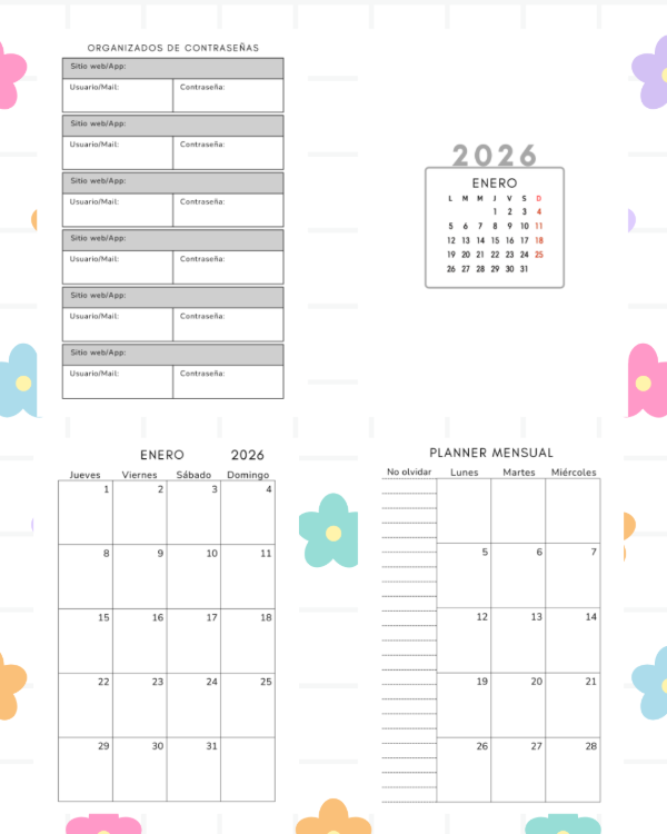 Carátula mensual con calendario planner mensual