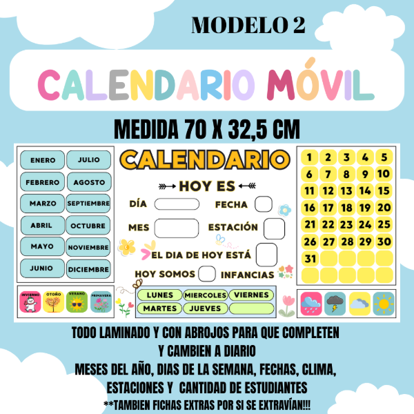 CARTEL CALENDARIO DE 70 X 32,5 CM LAMINADO DE AMBOS LADOS Y FICHAS CON ABROJOS INTERCAMBIABLES PARA COMPLETAR DIAS DE LA SEMANA, FECHAS, CLIMAS, ESTACIONES DEL AÑO, Y CANTIDAD DE INFANCIAS EN LA SALA/SALÓN